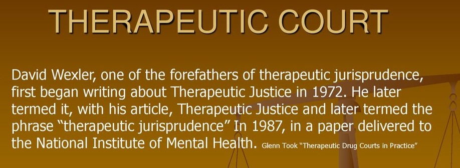 David Wexler, one of the forefathers of therapeutic jurisprudence, first began writing about Therapeutic Justice in He later termed it, with his article, Therapeutic Justice and later termed the phrase therapeutic jurisprudence In 1987, in a paper delivered to the National Institute of Mental Health. Glenn Took Therapeutic Drug Courts in Practice Therapeutic Jurisprudence concentrates on the law’s impact on emotional life and psychological well-being. It is a perspective that regards the law (rules of law, legal procedures, and roles of legal actors) itself as a social force that often produces therapeutic or anti-therapeutic consequences. It does not suggest that therapeutic concerns are more important than other consequences or factors, but it does suggest that the law’s role as a potential therapeutic agent should be recognized and systematically studied. Wexler.
